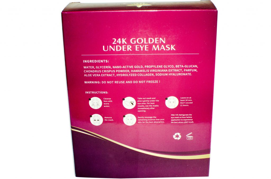 - 24K Gold Plant based Collagen Eye Mask with Pure Nano-Active Gold is a luxury anti-oxidant having anti-inflammatory properties which helps eliminate harmful toxins and accelerates blood circulation.